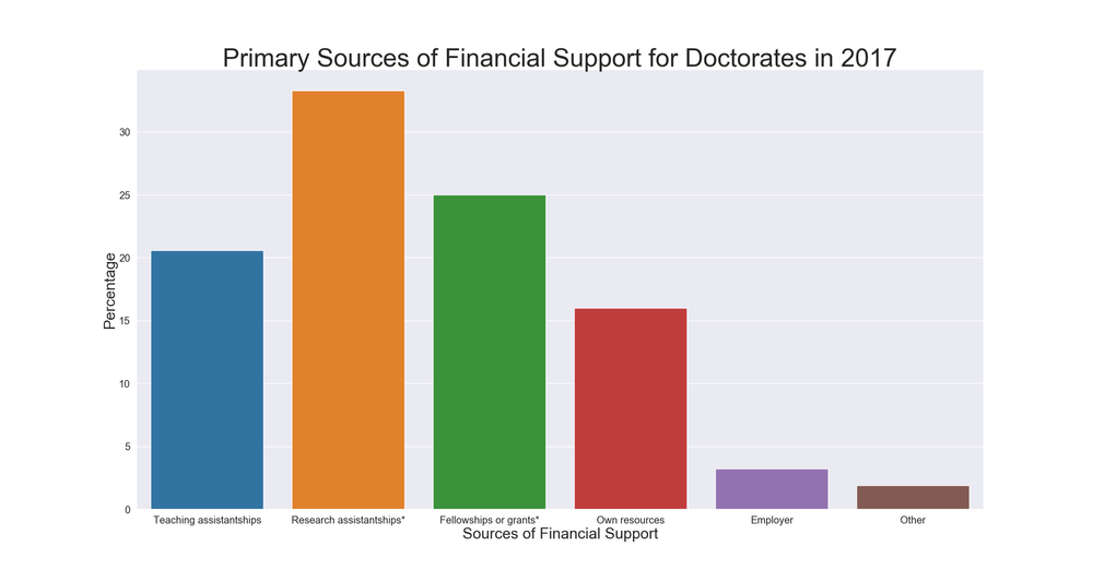 **Switching over to funding resources, 78.9% PhDs support themselves via various stipends, including teaching assistantships (20.6%), research assistantships (33.3%), or fellowships/grants (25%). Approximately 3% receive financial support from their employers.