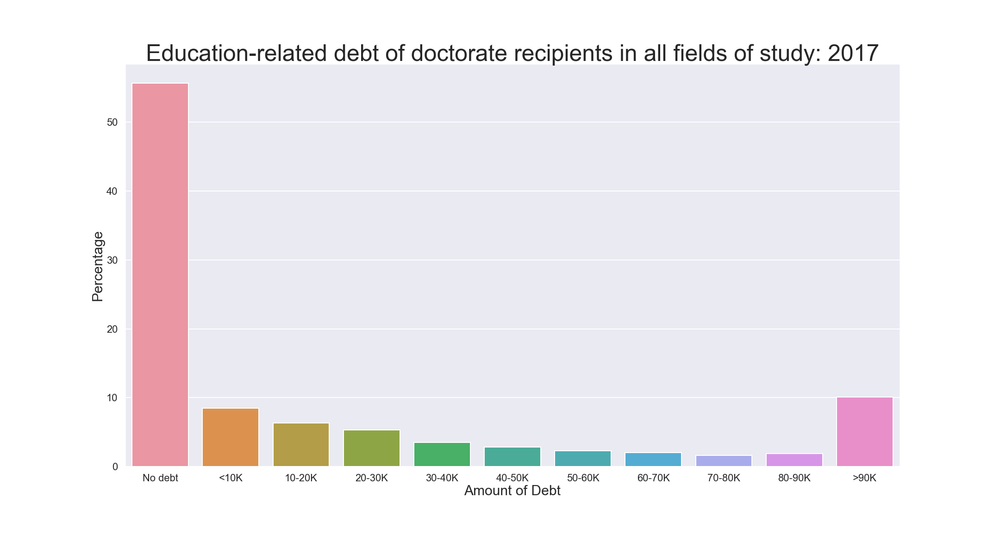 **More about financials, here is a brief look at the education-related debt of doctorate recipients. A little over half (55.7%) have no debt, but there remains a substantial proportion with some amount of debt, including 10.1% with over $90,000 in educational debt.