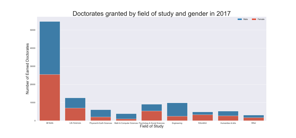 Taking a look at doctorates granted by broad fields of study and gender in 2017, we can see that across all fields, there is a fairly even split between male and female doctorate recipients. Broken down by the fields of study, there are gender differences. PhDs in Humanities and arts remain evenly split, as do ones in other subject categories. Female recipients make up a larger proportion of doctorates in Education, Psychology, Social Sciences, and Life Sciences. However, female doctorates are in the minority in Physical and Earth Sciences, Math and Computer Science, and Engineering. While we have made strides in increasing female participation in postgraduate education, there still remains work to be done in increasing female participation in STEM fields.