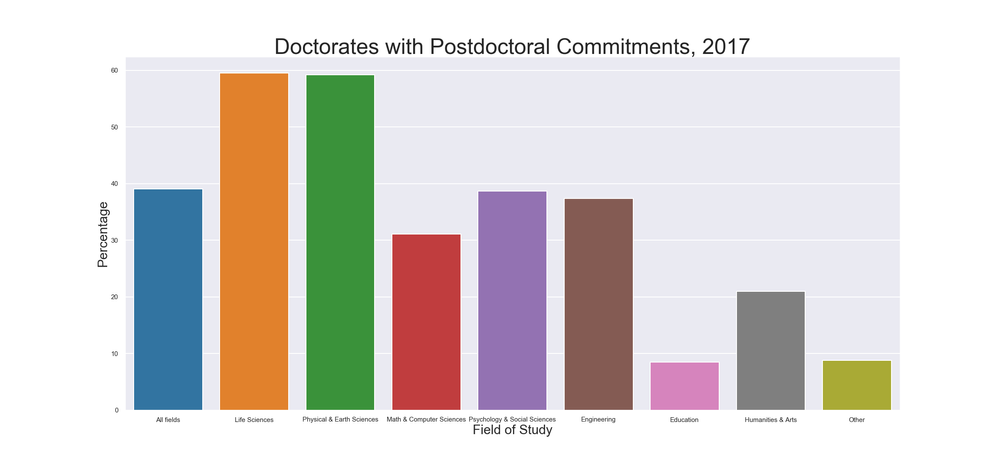 While a postdoc is not the only opportunity one can take after receiving a PhD, it is one of the more common paths. Nearly 39% PhDs have a postdoctoral commitment, with approximately 59% of PhDs in life sciences and physical and earth sciences going into postdocs. On the other end, less than 8.5% of PhDs in education have postdoctoral commitments. It’s okay if you aren’t interested in doing a postdoc after you finish your PhD. If you want to know more about career exploration, check out our post here.
